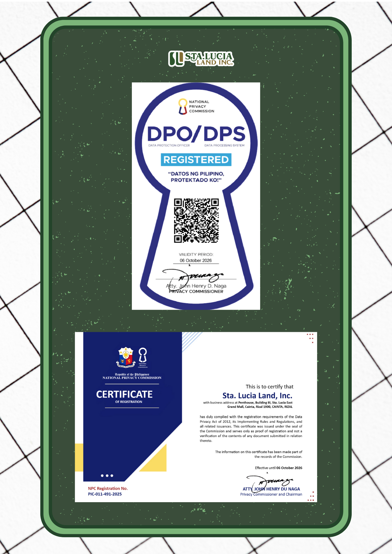 Sta. Lucia Land Inc. (SLI) respects and protects your personal data privacy. SLI processes and protects the confidentiality of any personal and sensitive personal information that you may provide. We also use cookies to give you the best experience on our website. By clicking the "I AGREE" button, you are allowing us to use them accordingly based on the terms stated in SLI's Privacy StatementI Agree